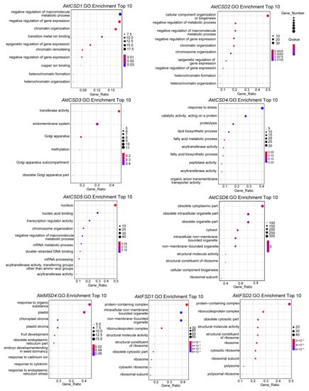 We further focused on the set of genes expressed in association with the 9 AktSODs from the module in which the AktSODs are located (Table S5). GO enrichment analysis was performed on the 9 AktSOD-associated gene sets, and the results are illustrated in Figure 6. The AktSOD genes assigned to the same module collectively participate in a large number of identical metabolic networks, but there are also differences. For example, the gene sets associated with the expression levels of AktCSD1 and AktCSD2 were enriched in the negative regulation of gene expression and chromatin organization. Conversely, AktCSD1-related genes were more assigned to the negative regulation of macromolecule metabolic processes, unlike AktCSD2. The gene sets associated with the expression levels of AktFSD1, AktFSD2 and AktCSD6 were all enriched in the obsolete cytoplasmic part and ribosomal subunit, and the metabolic network involving AktFSD1 and AktFSD2 was more similar than that of AktCSD6. In addition, it is worth noting that the gene set associated with the expression level of AktCSD4 is associated with the response to stress, and that the gene set associated with the expression level of AktMSD4 is related to fruit development.