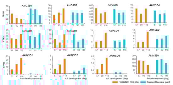 Transcriptome data for rind tissues with different disease resistance levels were used to explore the expression of AktSODs in response to various pathogenic bacteria. By comparing the expression levels of AktSODs in resistant rinds (a mixed pool of 24 lines) and susceptible rinds (a mixed pool of 50 lines), it was found that almost all AktSODs were significantly expressed in resistant or susceptible rinds, except for AktCSD7 (Figure 7; Table S6). Among the 12 AktSODs, AktCSD2, AktFSD1, and AktFSD2 showed more drastic upregulation in resistant rinds during the period of rapid fruit expansion than in susceptible lines. In addition, the three MnSODs (AktMSD1, AktMSD2 and AktMSD3) were rapidly upregulated in resistant rinds, with extremely weak or even no expression in susceptible rinds.