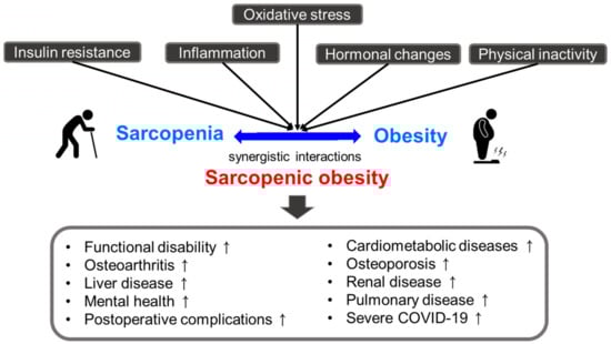 Obesity and sarcopenia have common pathophysiological characteristics, including insulin resistance, inflammation (increased secretion of pro-inflammatory markers and decreased anti-inflammatory markers), hormonal changes (a decline in growth hormone, testosterone, and estrogen), lack of physical activity, and oxidative stress [,,,]. As a result of their synergistic interactions, sarcopenic obesity may have deleterious effects on health compared with those of either condition alone [,,,,,,,,,,]. Several studies have suggested that sarcopenic obesity is linked to an increased risk of functional disability, cardiometabolic diseases (cardiovascular disease, type 2 diabetes, and hypertension, among others), and other comorbidities, such as liver disease, osteoarthritis, osteoporosis, pulmonary disease, renal disease, mental health problems (cognitive impairment and depression, among others), postoperative complications, and severe COVID-19 [,,,,,,,,,,] (Figure 1).