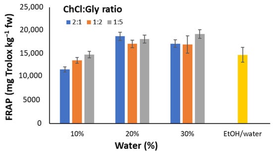 Influence of ChCl:Gly ratio (2:1, 1:2, and 1:5) and water percentage (10%, 20%, and 30%) on the overall antioxidant capacity by FRAP. Results are compared with that from EtOH/water (20:80, v/v) extract as the reference of conventional solvent. Error bars indicate the standard deviations.