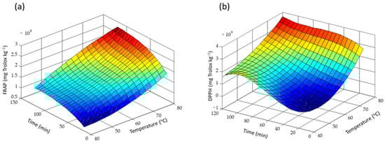Effect of temperature and extraction time on (a) the antioxidant capacity (FRAP) and (b) the radical scavenger capacity (DPPH).