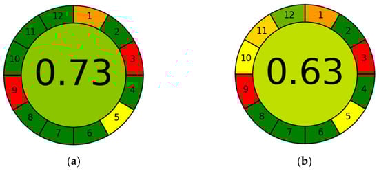 Graphs obtained with AGREE: (a) extraction with NADES and (b) extraction with ethanol/water. Identification of numbers: 1, Avoid Sample Treatment; 2, Minimal Sample Size; 3, In Situ Measurements; 4, Save Reagents; 5, Automated and Miniaturized Methods; 6, Derivatization Avoided; 7, Waste Avoided; 8, Multianalyte Methods; 9, Energy Minimized; 10, Reagents from Renewable Source; 11, Toxic Reagents Eliminated; 12, Operator Safety.