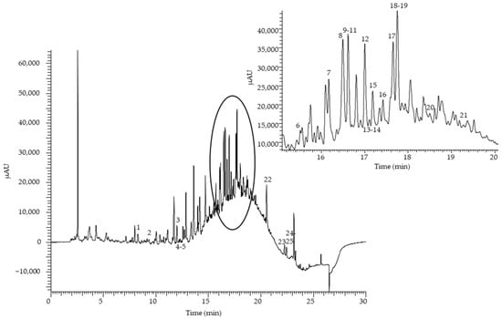 The resulting extracts were analyzed by liquid chromatography with ultraviolet detection and coupled to mass spectrometry. LC-UV-MS and LC-UV-MS/MS methods previously established by Mir-Cerdà et al. were adapted to this case []. Compounds were separated in a Kinetex C18 column (150 mm × 4.6 mm I.D., 2.6 µm particle size) from Phenomenex (Torrance, CA, USA) using 0.1% (v:v) formic acid aqueous solution and acetonitrile (ACN) as the components of the mobile phase. The flow rate was 0.7 mL min−1, and the elution gradient was as follows: 0 to 10 min, 3% to 15% ACN; 10 to 20 min, 15% to 45% ACN; 20 to 22 min, 45% to 90% ACN; 22 to 24 min, 90% ACN; (column cleaning); 24.0 to 24.2 min, 90% to 3% ACN; and 24.2 to 30 min, 3% ACN (column stabilization). The injection volume was 10 µL. UV absorbance from 190 to 400 nm was recorded.