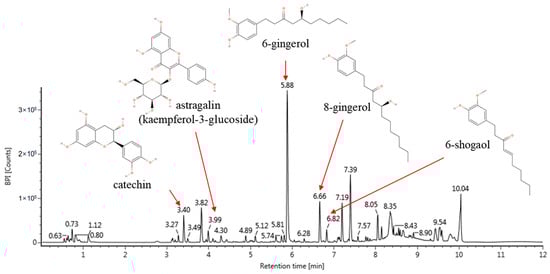 The results of identifying the bioactive compounds of DBZO through UPLC-Q-TOF/MS are as follows: catechin (retention time (RT), 3.40 min; adduct ion, 291; fragments; 139 and 273), astragalin (kaempferol-3-glucoside) (RT, 3.99 min; adduct ion, 449; fragments; 257, 269, and 287), 6-gingerol (RT, 5.88 min; adduct ion, 317; fragments, 115, 117, and 145), 8-gingerol (RT, 6.66 min; adduct ion, 345; fragments, 115 and 145), and 6-shogaol (RT, 6.82 min; adduct ion, 277; fragments, 94, 122, 137, and 177) (Figure 1 and Table 2) [,,].