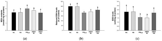 The PM2.5 group (3.01 nmol/mg of protein) showed an increase in MDA contents compared to the NC group (2.48 nmol/mg of protein). However, the DBZO100 group (2.43 nmol/mg of protein) demonstrated a significant reduction in MDA contents compared to the PM2.5 group (Figure 3a).