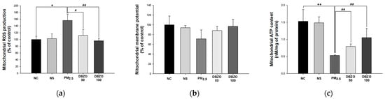 Effects of DBZO on mitochondrial function in lung tissues of PM2.5-exposed BALB/c mice. (a) Mitochondrial reactive oxygen species (ROS) production, (b) mitochondrial membrane potential, and (c) mitochondrial ATP content. The results are presented as mean ± SD (n = 4). Data are statistically represented with * = significantly different from the NC group, and # = significantly different from the PM2.5 group; * and # = p < 0.05 and ** and ## = p < 0.01.