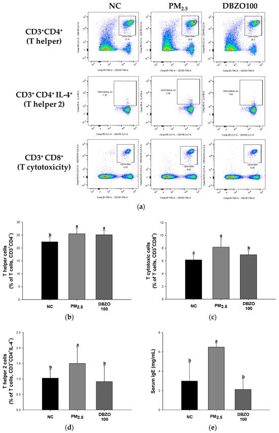 Effects of DBZO on inflammatory cells in whole blood and immunoglobulin E (IgE) levels in serum of PM2.5-exposed BALB/c mice. (a) Flow cytometry plots, frequency of (b) CD3+CD4+ T cells, (c) CD3+CD8+ T cells, (d) CD3+CD4+IL-4+ T cells in whole blood, and (e) IgE levels in serum. The results are presented as mean ± SD (b–d, n = 5; e, n = 3). Data were statistically considered at p < 0.05, and different small letters represent the statistical differences.