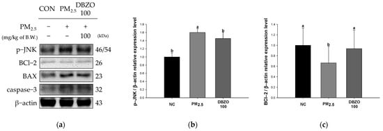 Mitochondria, the primary site of ROS production, are significantly more susceptible to oxidative stress than other cellular components, and their damage is reported to induce various physiological and pathological processes, including respiratory diseases [,]. Generally, the mitochondrial respiratory chain maintains a balance between ROS production and elimination, but PM2.5 disrupts this equilibrium, resulting in excessive ROS generation []. It can damage mitochondrial structural proteins and membrane potential, ultimately impairing energy metabolism and causing cellular damage []. Santos et al. reported that catechins regulate the function of Complex I of the respiratory chain, thereby modulating ATP synthesis capacity in MRC-5 fibroblasts with amiodarone-induced mitochondrial dysfunction []. Similarly, Han et al. noted that 6-gingerol exhibits cardioprotective effects by improving mitochondrial membrane damage and edema in a mouse model of cardiac toxicity induced by As2O3 []. Likewise, in this study, the lung tissue of the group administrated with DBZO exhibited regulated levels of ROS, mitochondrial membrane proteins, and ATP compared to the PM2.5 group (Figure 4). Additionally, the increased ROS resulting from oxidative stress and mitochondrial damage can activate the JNK pathway and further exacerbate oxidative stress []. JNK plays a crucial role in apoptosis by modulating BCl-2 family proteins, inhibiting BCl-2, an anti-apoptotic protein, while promoting the activation of BAX, a pro-apoptotic protein on the mitochondrial outer membrane, which subsequently increases membrane permeability []. Ultimately, this cascade of events leads to apoptosis by activating caspase-3 []. Cho et al. noted that astragalin inhibited the expression of p-JNK protein in BEAS-2B cells stimulated to H2O2 and concentration-dependently suppressed caspase-3 activity in BEAS-2B cells stimulated to lipopolysaccharide []. Furthermore, Han et al. reported that pretreatment of 6-shogaol reduced BAX and caspase-3 in ultraviolet A-stimulated human dermal fibroblast cells in a dose-dependent manner []. Similarly, in the lungs of the DBZO-administered group in this study, the expression of apoptosis-related proteins was improved compared to the PM2.5 group (Figure 8). These findings indicate that DBZO, which contains various bioactive compounds, may protect the respiratory system from PM2.5 exposure by protecting mitochondrial function and regulating the expression of apoptosis-related proteins.