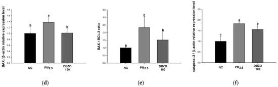 The PM2.5 group (71.31%, p = 0.066) showed a reduction in mitochondrial membrane potential compared to the NC group (100.00%). However, the DBZO100 group (96.83%, p = 0.069) showed an increase in mitochondrial membrane potential compared to the PM2.5 group. However, there was no significant difference between the groups (Figure 4b).