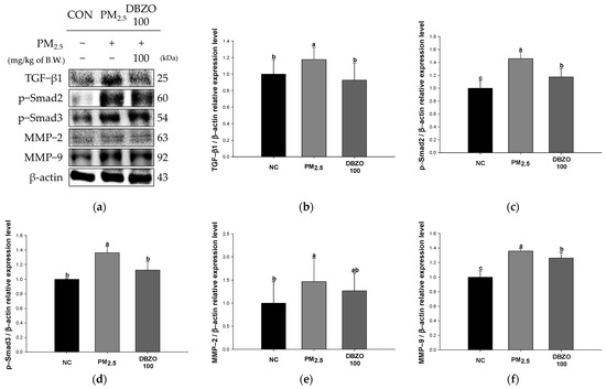 Effects of DBZO on pulmonary fibrosis-related protein expression levels in lung tissues of PM2.5-exposed BALB/c mice. (a) Western blot images, protein expression levels of (b) TGF-β1, (c) p-Smad2, (d) p-Samd3, (e) MMP-2, and (f) MMP-9. The results are presented as mean ± SD (n = 3). Data were statistically considered at p < 0.05, and different small letters represent the statistical differences.