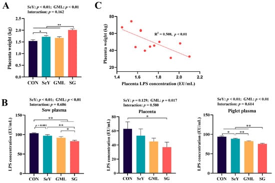 Litter placenta weight and sow plasma, sow placenta, and piglet plasma LPS levels: (A) maternal placenta weight; (B) sow plasm, sow placenta, and piglet plasma LPS levels; (C) regression analysis of placental weight and placental LPS content. CON, control; SeY, selenium yeast; GML, glycerol monolaurate; SG, selenium yeast + glycerol monolaurate. Data are presented as the means ± SEM; * p < 0.05 and ** p < 0.01.
