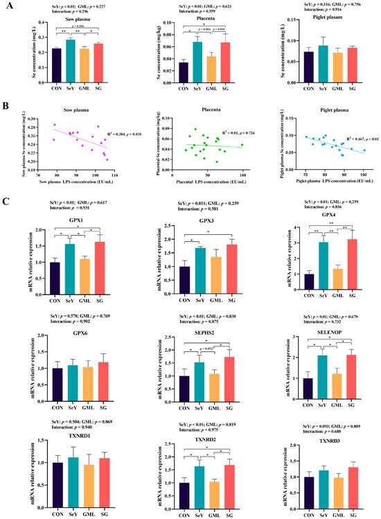 Transport of Se along the maternal–placental–fetal axis: (A) total Se content in the sow plasma, sow placenta, and piglet plasma; (B) regression analysis of the total Se content in sow plasma, sow placenta, and piglet plasma LPS content; (C) placental selenoprotein mRNA expression. CON, control; SeY, selenium yeast; GML, glycerol monolaurate; SG, selenium yeast + glycerol monolaurate. Data are presented as the means ± SEM; * p < 0.05 and ** p < 0.01.