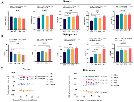 Maternal–placental–fetal axis redox status: (A) T-AOC, MDA, SOD, GSH, and GSH-PX activities in the placenta; (B) T-AOC, MDA, SOD, GSH, and GSH-PX activities in the piglet plasma; (C) regression analysis of the placental and piglet plasma redox statuses with the LPS content. CON, control; SeY, selenium yeast; GML, glycerol monolaurate; SG, selenium yeast + glycerol monolaurate. Data are presented as the means ± SEM; * p < 0.05 and ** p < 0.01.