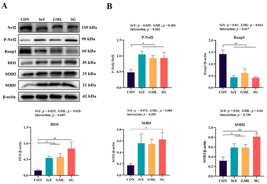 Maternal–placental–fetal axis Nrf2 antioxidant pathway: (A) Nrf2 antioxidant pathway Western blot results; (B) protein expression of placental Nrf2 antioxidant pathway (P-Nrf2/Nrf2, Keap1, SOD1, SOD2, and HO-1). CON, control; SeY, selenium yeast; GML, glycerol monolaurate; SG, selenium yeast + glycerol monolaurate. Data are presented as the means ± SEM; * p < 0.05 and ** p < 0.01.