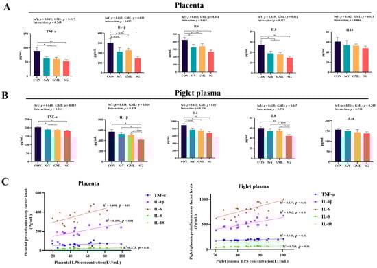 Inflammation levels in placenta and piglet plasma: (A) levels of pro-inflammatory factors TNF-α, IL-1β, IL-6, IL-8, and IL-18 in the placenta; (B) levels of pro-inflammatory factors (TNF-α, IL-1β, IL-6, IL-8, and IL-18) in the plasma of piglets; (C) regression analysis of plasma levels of pro-inflammatory factors in placenta, piglets, and their LPS content. CON, control; SeY, selenium yeast; GML, glycerol monolaurate; SG, selenium yeast + glycerol monolaurate. Data are presented as the means ± SEM; * p < 0.05 and ** p < 0.01.