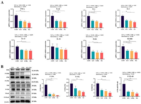 Expression of placental pro-inflammatory cytokine genes and inflammatory pathway protein expression: (A) mRNA expression of placental proinflammatory factors (TNF-α, IL-1β, IL-6, IL-8, IL-12, IL-18, TLR4, and MYD88); (B) expression of placental MAPK (P-ERK/ERK, P-JNK/JNK, and P-P8/P38) and NF-κB signaling pathway-related proteins. CON, control; SeY, selenium yeast; GML, glycerol monolaurate; SG, selenium yeast + glycerol monolaurate. Data are presented as the means ± SEM, * p < 0.05; ** p < 0.01.