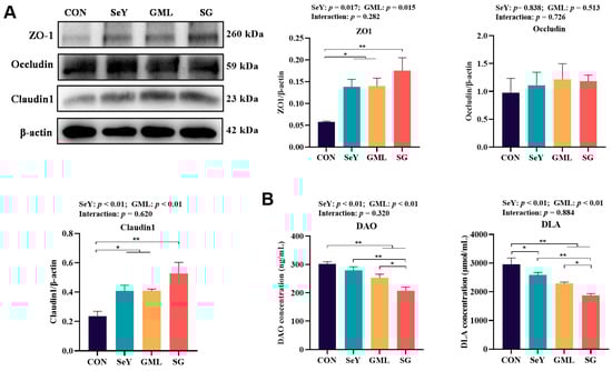 Maternal gut-placental barrier: (A) placental tight junction (ZO-1, Occludin, and Claudin-1) protein expression; (B) maternal intestinal permeability index (DAO and DLA). CON, control; SeY, selenium yeast; GML, glycerol monolaurate; SG, selenium yeast + glycerol monolaurate. Data are presented as the means ± SEM; * p < 0.05 and ** p < 0.01.