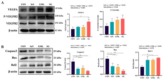 Maternal placental development: (A) placental vascular endothelial growth factor signaling pathway (VEGFA and P-VEGFR2/VEGFR2) protein expression; (B) placental apoptosis signaling pathway (caspase-3, Bax, and Bcl-2) protein expression. CON, control. SeY, selenium yeast, GML, glycerol monolaurate. SG, selenium yeast + Glycerol monolaurate. Data are presented as the means ± SEM, * p < 0.05; ** p < 0.01.