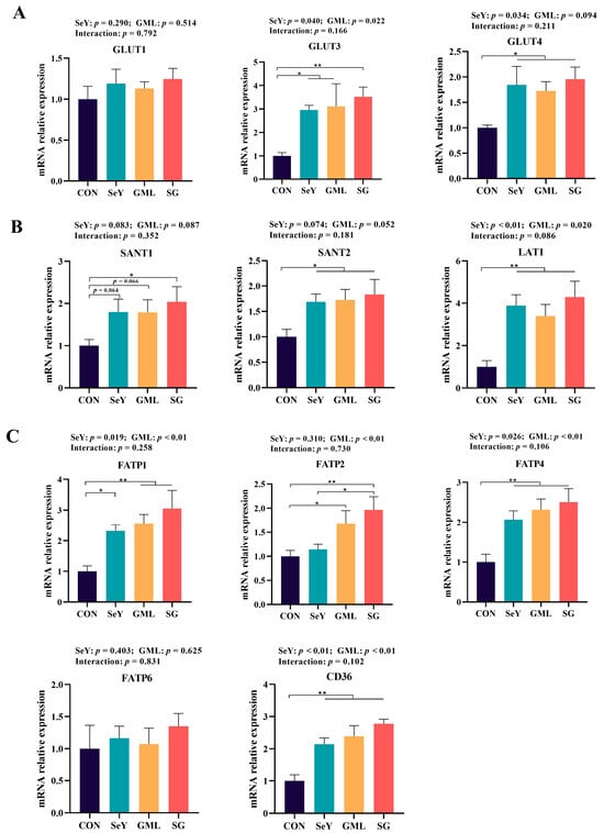 Sow placental nutrient transporter gene expression: (A) placental glucose transporter mRNA expression (GLUT1, GLUT3, and GLUT4); (B) placental amino acid transporter carrier mRNA expression (SANT1, SANT2, and LAT1); (C) placental fatty acid transporter mRNA expression (FATP1, FATP2, FATP4, FATP6, and CD36). CON, control; SeY, selenium yeast; GML, glycerol monolaurate; SG, selenium yeast + glycerol monolaurate. Data are presented as the means ± SEM; * p < 0.05 and ** p < 0.01.