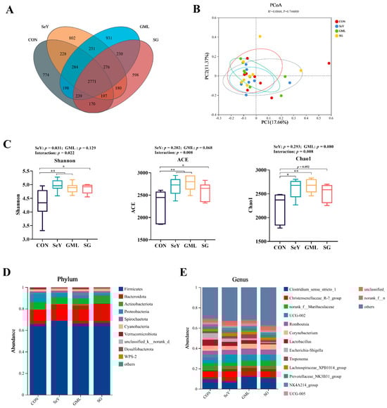 Microbial structure and diversity: (A) Venn diagram of the OTUs; (B) principal component analysis (pCoA) scores plot; (C) Shannon index, ACE index, and Chao1 index of microbiota; (D) relative abundance at the phylum level; (E) relative abundance at the genus level. CON, control; SeY, selenium yeast; GML, glycerol monolaurate; SG, selenium yeast + glycerol monolaurate. Data are presented as the means ± SEM; * p < 0.05 and ** p < 0.01.