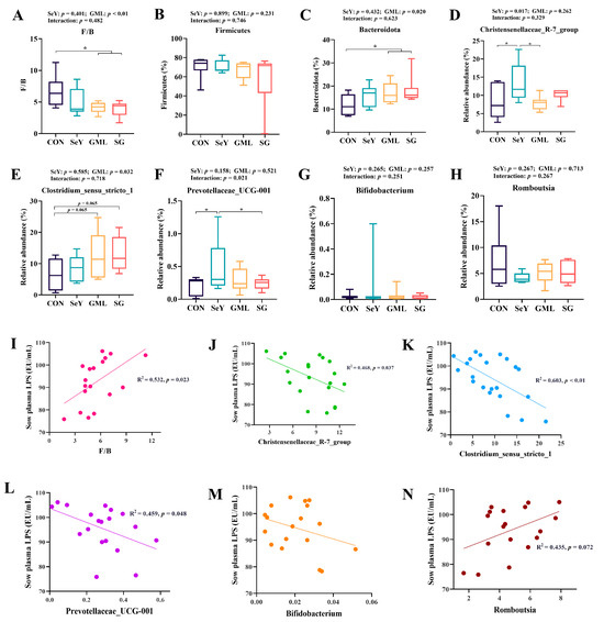 Gut microorganisms for the phylum- and genus-level analysis and regression analysis with sow plasma LPS: (A–H) microbial phylum- and genus-level analysis; (I–N) regression analysis of the microbial phylum and genus levels and sow plasma LPS. CON, control; SeY, selenium yeast; GML, glycerol monolaurate; SG, selenium yeast + glycerol monolaurate. Data are presented as the means ± SEM. * p < 0.05.