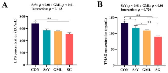 To further confirm the impact of dietary SeY and GML supplementation on sow gut microbiota, we assessed the levels of LPS and TMAO in the sow plasma. The results demonstrate a significant reduction in their levels (p < 0.01) (Figure 12).