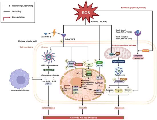 ROS can directly activate NF-κB signalling by inducing phosphorylation and degradation of its endogenous inhibitor IκB []. This allows NF-κB to translocate from the cytosol to the nucleus and function as a transcription factor. NF-κB is activated in response to different stimuli, including elevated ROS levels during oxidative stress [,]. Activated NF-κB perpetuates renal inflammation and fibrosis by upregulating NF-κB and pro-inflammatory mediators (TNF-α) and inflammatory cytokines (IL-1β and IL-18) [,]. These cytokines can induce the expression of chemokines and adhesion molecules in kidney tissues, boosting immune cell recruitment and aggravating chronic inflammation. Moreover, they would also promote renal interstitial fibrosis and elevate proinflammatory chemokines and cytokines via increasing CTGF expression [].