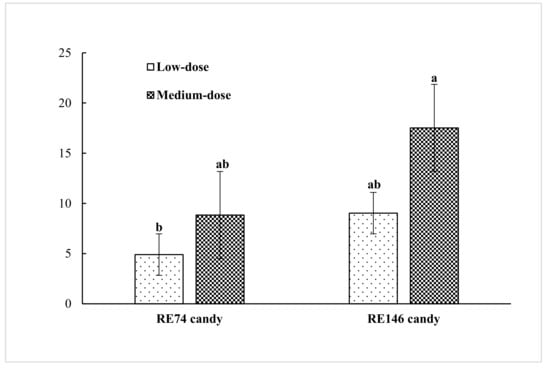 Rosmarinic acid recovery (μg/g) in jelly candies. Abbreviations: RE74 and RE146: rosemary extract of different polyphenol content. a, ab, b RE x D effects for p < 0.05.