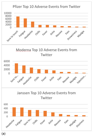 (a) The most frequently mentioned VAEs by Twitter users. (b) The most frequently mentioned VAEs in VAERS.