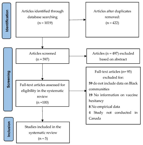 The PRISMA flow diagram of study retrieval and selection is provided in Figure 1. A total of 1019 studies were imported into Covidence for screening. After removing duplicates (n = 422), two authors screened the title and abstracts of the 597 studies, excluding 497 of them. One hundred full texts were assessed for eligibility in the systematic review and 95 were excluded (more details are provided in Figure 1). A total of five cross-sectional studies underwent qualitative reviews for the current study [,,,,]. The characteristics and main findings of these studies are presented in Table 1. All participants in the included studies were 20,919 individuals living in Canada, with 247 (1.18%) identifying as Black (Black communities in Canada represent 3.5% of the national population).