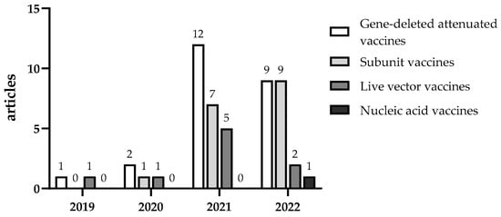 African swine fever (ASF) is an acute, febrile, highly contagious disease of pigs caused by the infection with African swine fever virus (ASFV). ASF is on the list of notifiable diseases of the World Organization for Animal Health (WOAH) and is classified as a Class I animal disease in the Chinese list of animal pathogenic microorganisms, which refers to diseases that pose a serious threat to humans and animals and require urgent, severe and compulsory measures for their prevention, control and eradication. ASFV can be transmitted over long distances through pork products, swill and other items, which has set the precedent for transcontinental outbreaks. In 2018, ASF appeared suddenly in China and the development of the African swine fever vaccine was initiated [,]. In the past 4 years (2018–2022), several groups in China have presided over/participated in the research and development of various types of ASF vaccines. More than 50 vaccine-related articles have been published (Figure 1), with some studies making marked progress and reaching certain milestones. To provide a reference for further progress worldwide, we have provided a comprehensive and systematic summary of all of the relevant data regarding the current status of the development of ASF vaccines in China.