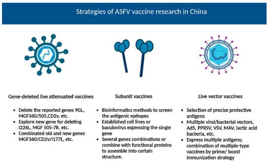 Based on previous experience in animal disease vaccine design and improved understanding based on previous research on the ASF subunit and live vector vaccines, Chinese researchers have adopted similar research strategies for the development of the ASF vaccine (Figure 2). For the subunit vaccine, the protein sequences were analyzed using bioinformatics methods [,,,] or by using monoclonal antibodies [] to screen the antigenic epitopes. Once identified, the ASFV antigenic proteins were combined with other bacterial/viral proteins or functional proteins [,], so that the expressed ASFV antigenic proteins could self-assemble into a certain structure or improve the expression efficiency to improve the immunogenicity of the ASFV proteins. For the live vector vaccines, different vectors [,,,,] and multiple gene expressions [,,] were also evaluated.