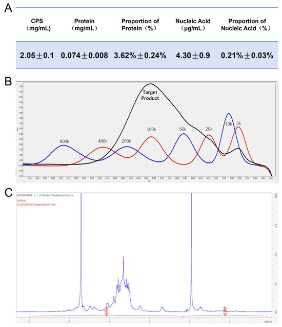 We quantified the levels of CPS, protein impurities, and nucleic acid impurities in the purified type Ia CPS, as depicted in Figure 1A. The measured protein and nucleic acid impurities were approximately 3.62% and 0.21%, respectively, indicating a low level of impurities in the obtained capsular polysaccharides. Then, we determined the molecular weight of purified CPS using HPLC (Figure 1B). By employing dextran as a standard reference, the molecular weight of purified type Ia CPS was approximately 100 kDa. Following lyophilization, NMR H-spectrum analysis confirmed that characteristic peaks in the samples were completely consistent with values reported in the literature [,] and no significant miscellaneous peaks were observed (Figure 1C). Based on these findings, it can be concluded that highly pure serotype Ia CPS from GBS strain 515 have been successfully obtained with a consistent size and structure, as reported in previous studies.