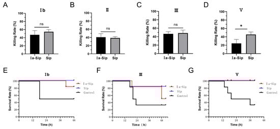 Protective efficacy against multi-serotype Group B Streptococci by immunized rabbit serum. (A–D) The opsonophagocytic assay was conducted using rabbit sera after the third immunization and differentiated HL60 cells. Different serotypes of GBS strains, including Ib strain SA-1 (A), II strain SA-28 (B), III strain COH1 (C), and V strain 2603V/R (D), were utilized and data are presented as means ± SD of at least three individual experiments. Unpaired Student t-tests were used for statistical analysis. * p < 0.05, and ns indicates no significance. (E,F) The passive immune protection experiments were performed on mice using rabbit sera after the fourth immunization from the Ia-Sip group and Sip group, with the control group receiving a mixture containing equal proportions of both sera before immunization. Survival curves of mice challenged by Ib strain SA-1 (E), III strain COH1 (F), and V strain 2603V/R (G) are shown here.