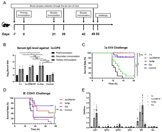 The immunization process of New Zealand white rabbits is depicted in Figure 3A. The serum titers of the Ia, Ia-CRM197, and Ia-Sip groups were determined by indirect ELISA using type Ia CPS antigen. Interestingly, it was observed that, following the second round of immunization, the CPS serum titer of the polysaccharide conjugate vaccine as an antigen was significantly higher than that of CPS alone (Figure 3B), consistent with previous reports indicating a lower IgG level generated by animals stimulated with polysaccharide antigens than those stimulated with polysaccharide conjugate product [,,].