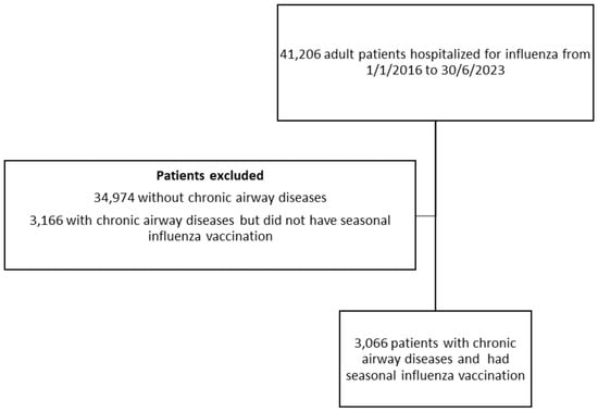 Adult patients with chronic airway diseases who had already received seasonal influenza vaccine and were admitted to public hospitals in Hong Kong for influenza from 1 January 2016 to 30 June 2023 were included. The eligible patients were identified from Clinical Data Analysis and Reporting System (CDARS) of Hospital Authority using International Classification of Diseases (Ninth Revision) code of 487.8 for influenza. The CDARS is an electronic health record (EHR) database managed by the Hong Kong Hospital Authority (HKHA), which is a public healthcare service provider with 43 hospitals and institutions, and 122 outpatient clinics, covering more than 90% of the Hong Kong population since 1993 [,,]. The CDARS captures medical information including diagnosis, drug prescription details, demographics, admissions, medical procedures, and laboratory results. The study was approved by the Institutional Review Board (IRB) of the University of Hong Kong and Hospital Authority Hong Kong West Cluster (UW 24-137) and all methods were performed in accordance with the relevant guidelines and regulations provided by the IRB. Patient informed consent was waived in this retrospective study by the IRB as there was no active patient recruitment and the data were already de-identified. The study was conducted in compliance with the Declaration of Helsinki.