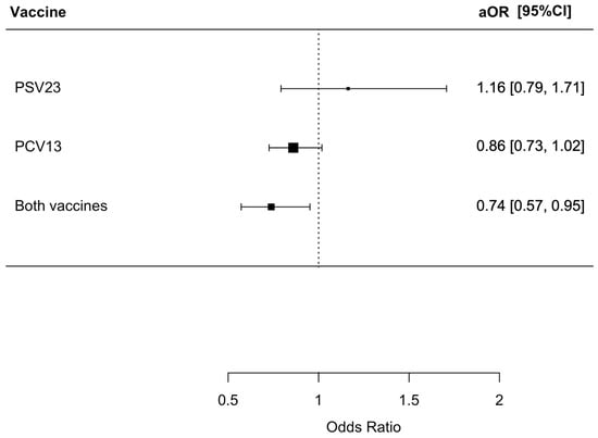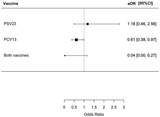 We found that 100 (4.1%) patients died from respiratory causes during the index admission, with 67 (4.4%), 6 (4.5%), 27 (2.5%), and 0 (0%) having no PSV23/PCV13, only PSV23, only PCV13, and both PSV23/PCV13 vaccinations, respectively (p < 0.001). Patients who received both PSV23/PCV13 and PCV13 only had a statistically lower risk of respiratory mortality with an OR of 0.034 (95% CI = 0.00–0.23, p = 0.002) and 0.56 (95% CI = 0.35–0.86, p = 0.008), respectively. The aOR for patients who received both PSV23/PCV13 and PCV13 were only 0.04 (95% CI = 0.00–0.27, p = 0.0038) and 0.61 (95% CI = 0.38–0.97, p = 0.036), respectively. The results are summarized in Figure 4.