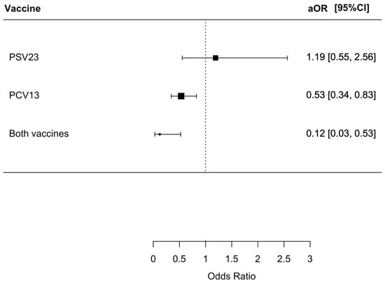 We found that 127 (4.1%) patients died from various causes within the index admission, with 87 (5.7%), 8 (6.0%), 30 (2.7%), and 2 (0.6%) having no PSV23/PCV13, only PSV23, only PCV13, and both PSV23/PCV13 vaccinations, respectively (p < 0.001). Patients who received both PSV23/PCV13 and PCV13 only had a statistically lower risk of all-cause mortality with an OR of 0.10 (95% CI = 0.03–0.42, p = 0.002) and 0.47 (95% CI = 0.31–0.71, p < 0.001), respectively. The aOR for patients who received both PSV23/PCV13 and PCV13 were only 0.12 (95% CI = 0.03–0.53, p = 0.005) and 0.53 (95% CI = 0.34–0.83, p = 0.005), respectively. The results are summarized in Figure 3.
