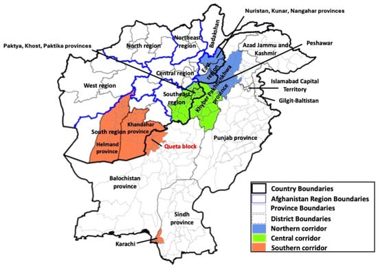 These two remaining WPV1-endemic countries constitute a single epidemiologic block, with each having unique factors affecting immunization activities and transmission [,]. This includes natural disasters, such as earthquakes in Afghanistan or flooding in Pakistan. Circulation in this block has been related to cross-border travels of highly migrant subpopulations transiting along established bidirectional population movement “corridors”: northern, central and southern (Figure 1) [,]. The northern corridor extends from the Afghanistan provinces of Nuristan, Nangarhar and Kunar in the east region to districts in northern Khyber Pakhtunkhwa (KP) province in Pakistan. The central corridor extends from Paktya, Khost and Paktika provinces of the southeast region in Afghanistan to southern KP districts in Pakistan. The southern corridor extends from Helmand and Kandahar provinces in the Afghanistan south region to Balochistan and Sindh provinces, primarily affecting districts in the Quetta block bordering Afghanistan and in Karachi, respectively.