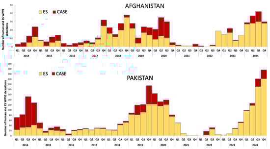 Number of wild poliovirus type 1 (WPV1) cases and number of environmental surveillance (ES) WPV1-positive samples by quarter for Afghanistan and Pakistan—2014–2024. Note: The number of ES sites substantially increased over this time period, which limits any time comparison of the number of ES detections.