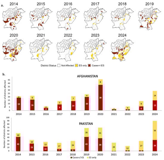 (a). Location of districts affected by wild poliovirus type 1 (WPV1) transmission confirmed by WPV1-positive cases and environmental surveillance (ES) samples. (b). Number of affected districts with WPV1-positive AFP cases or only WPV1-positive ES samples, by year, for Afghanistan and Pakistan—2014−2024. Note: The number of ES sites substantially increased over this time period, which limits any time comparison of the number of districts with ES detections.