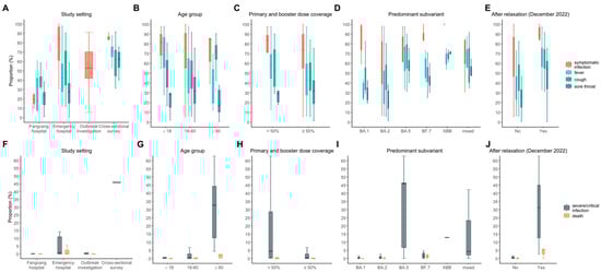 Distributions of the computed percentage of cases with fever, cough, sore throat, symptomatic, severe/critical, and deceased cases, disaggregated by (A,F) study design, (B,G) age group, (C,H) primary and booster vaccination coverage, (D,I) predominant circulating Omicron subvariants, and (E,J) whether the study was conducted during the pre- or post-relation period. Boxes indicate interquartile ranges while bold horizontal lines in the boxes represent the median values of computed estimates. Vertical lines give the range (minimums and maximums) of computed estimates by each factor.
