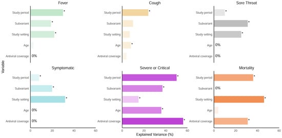 Relative decreases in the heterogeneity in symptom and clinical severity estimates when incorporating epidemiological and demographic variables including age group, antiviral treatment coverage, study period, study setting, and the predominant circulating subvariant into the meta-analysis. The asterisk symbols (*) indicate statistical significance for moderator test (Wald Z-test) with p-value < 0.05.