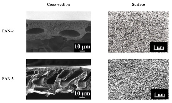 SEM surface microphotographs of the PAN membranes demonstrate that the pore size and porosity of the surface of the selective layer of membranes increase in the series: PAN 2 < PAN 3 < PAN 4 < PAN 5 (Figure 4). The surfaces of the PAN-3 and PAN-4 membranes have rougher structure compared to PAN-2. The surface of the PAN-5 substrate has the most compacted structure of the selective layer with large pores on the surface.