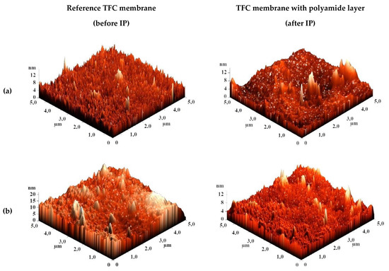 The surface topography of the CS-based membranes and their roughness before and after IP were studied by atomic force microscopy (AFM). AFM images of the surface of TFC membranes without and with a polyamide layer formed via IP with a scan size 5 × 5 µm are presented in Figure 7.