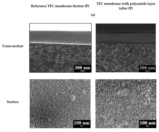 SEM micrographs of the cross-section and the selective surface structure of CS-based TFC membranes and PAN substrates were obtained using Zeiss Merlin SEM (Carl Zeiss SMT, Oberhochen, Germany). The cross-section of samples was obtained by submerging the sample in liquid nitrogen for 10–20 s and subsequent splitting perpendicular to the surface. SEM images were obtained at a voltage of 1 kV.