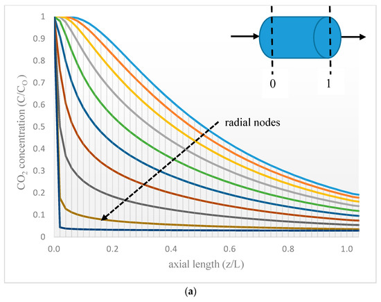 The mass transfer equations and boundary conditions were related to the tube side. The radial and axial coordinates of the fiber are presented in Figure 3. Radial position r = 0 was pointed as the center of the fiber, and the axial distance of z = 0 represented the initial position of the gas in the fiber. The discretization method was based on the finite difference (FD) approach using the 4th order central finite difference (CFD4). Selecting an appropriate number of nodes (particularly in the radial direction) for the finite element analysis was very critical [46]. Under these considerations, 50 nodes were proposed in the axial and the radial directions to be in accordance with the 2-directional (r, z) mass transport.