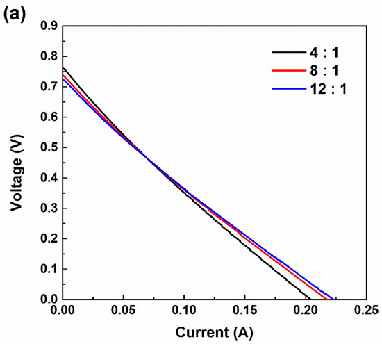 Figure 3a,b show the voltage–power (V–P) and current–power (I–P) plots according to the compositions of the IEMs of the small and large RED stacks, respectively. The results of the highest power on the RED stack according to experimental conditions were adopted from general current–voltage (I–V) curves (Figure S1). As shown in Figure 3a, the maximum powers from the small RED stack according to the 4:1, 8:1, and 12:1 PIEM compositions were 0.0351 W, 0.0361 W, and 0.0367 W, respectively. In addition, the large RED stack with PIEMs of the same compositions showed maximum powers of 0.254 W, 0.296 W, and 0.307 W, respectively. In the present study, a large RED stack had a nine times larger active area of the electrode than a small RED stack; thus, power generation on the large RED stack would be nine times higher than on the small RED stack, assuming a linearity between stack size and power generation. However, there were certain differences between the experimental results and the expected value on the large RED stack. The power loss ratios by enlarging stack size were 19.6%, 8.9%, and 7.1% at RED stacks with 4:1, 8:1, and 12:1 PIEM compositions. The reduction in power losses according to the IEM composition on the large RED stack is primarily attributed to the parasitic ionic current across the IEMs. The salinity gradient across the IEMs is the driving force of ion transport, and it is constant regardless of the IEM composition. However, the IEC value determines the total amount of the escapable ions in the high concentration compartment. The ions excluded from the ion exchange are still affected by salinity gradient, thus generating the parasitic ionic current.