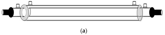 A schematic diagram of the experimental setup of the concentric circular gas–liquid membrane contactor for CO2 absorption by MEA absorbent was presented as illustrated in Figure 6. The spiral wired concentric circular modules under concurrent- and countercurrent-flow operations while inserting spiral wires into the lumen side along the acrylic ring tube are illustrated in Figure 2 and Figure 5. Figure 6a,b illustrate the schematic representations of the concentric circular membrane contactor module with a spiral wired annulus channel, where the MEA solution is passing through the shell side and the gas feed is flowing through the tube side.