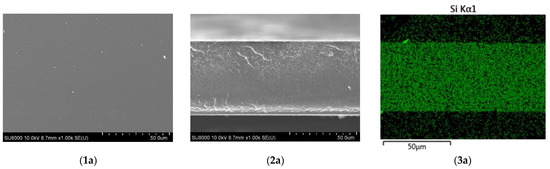 According to the SEM EDX data (Figure 3), all the obtained samples have a dense structure without porosity, which is important for the use of membranes in fuel cells. X-ray microanalysis data confirm the homogeneity of the samples and uniform distribution of silicon throughout the film volume. It should be noted that the authors of [25] observed the formation of micropores in the structure of membranes after silanol crosslinking, which they attributed to the escape of alcohol and water molecules after the hydrolysis of the alkoxy groups of silanes. In our case, the membranes remained dense and homogeneous, which was probably due to the drying conditions after hydrolysis.